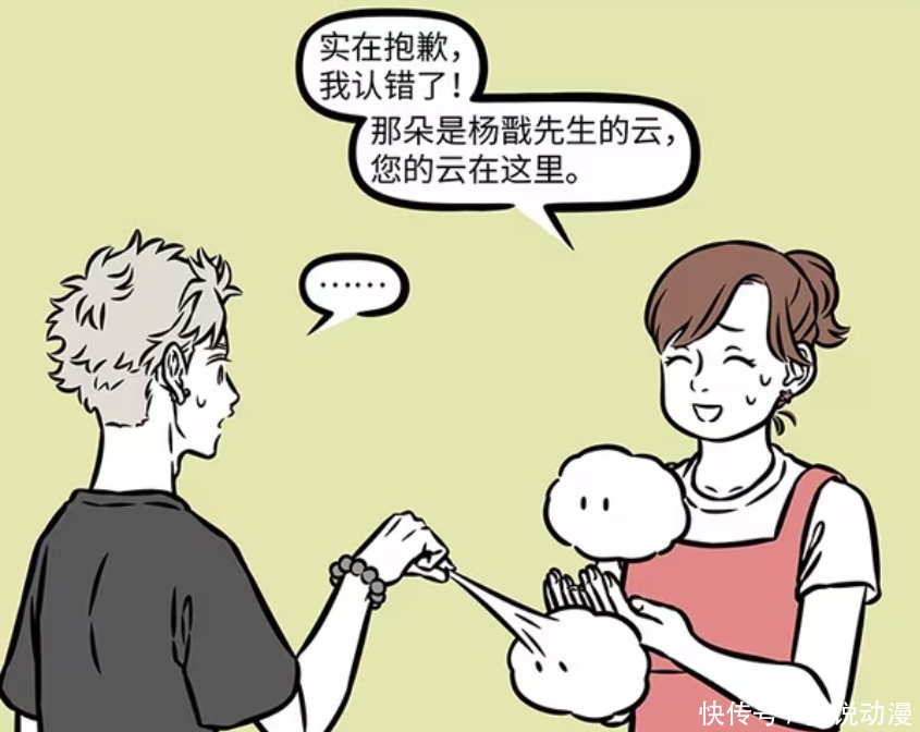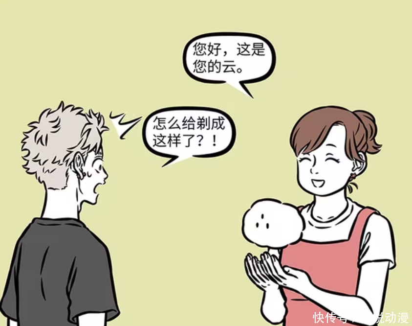 《非人哉》漫画版,托尼老师可以说是经常出现的配角,经常给各个角色理发。这一次托尼老师是前往宠物美容院兼职。筋斗云刚好被孙悟空送过来剃毛,托尼老师在不知道该怎么剪的情况下倍加网配资,直接让筋斗云大瘦身。孙悟空过来接筋斗云的时候,认错了云。杨戬的云太像孙悟空的云,只是额头上多了个小黑点。
