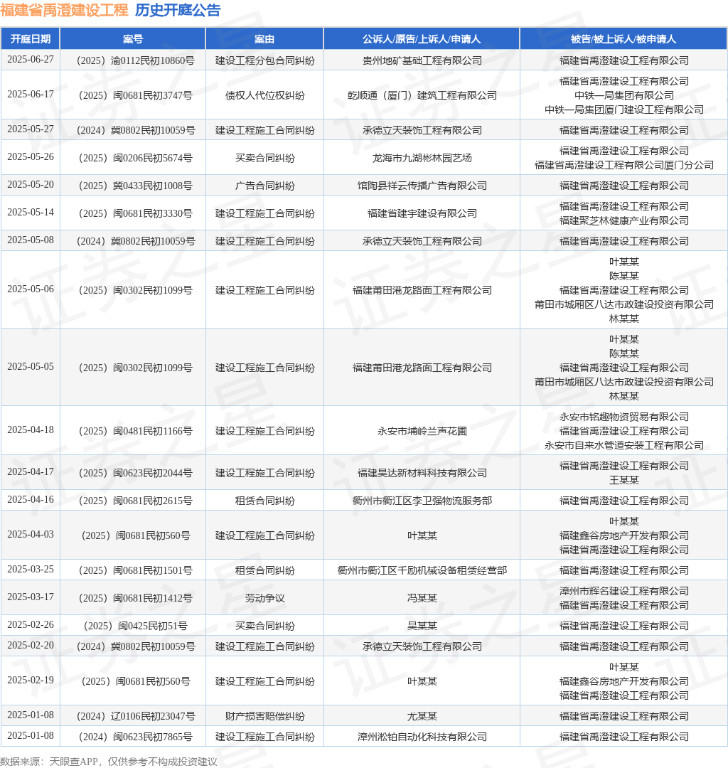 本站消息,根据天眼查APP显示,近日公布了一则福建省禹澄建设工程有限公司作为被告/被上诉人的开庭公告镕盛融资,详细内容如下: